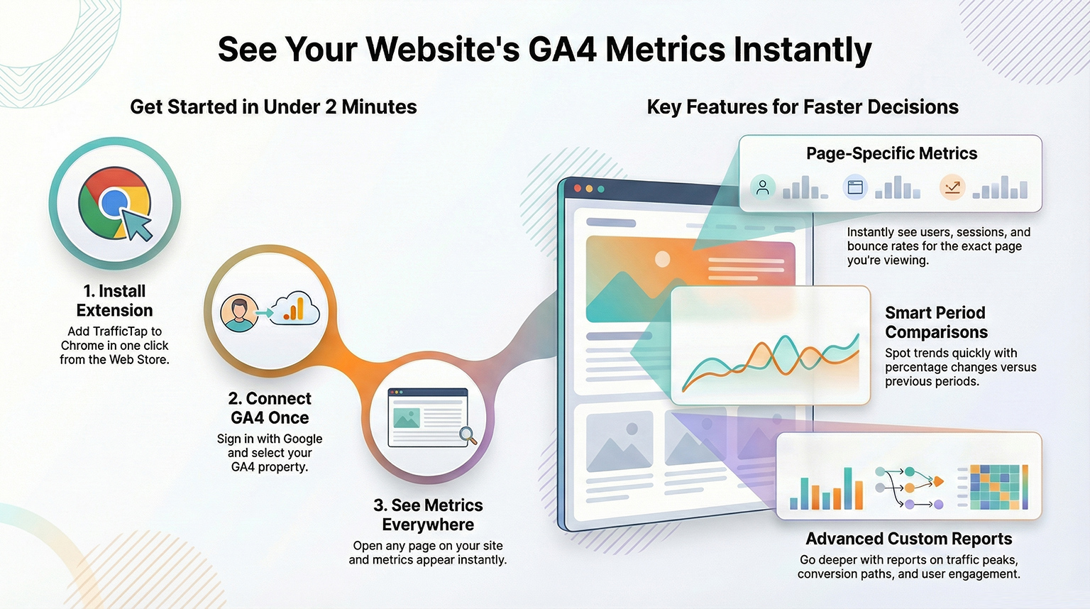 "I developed TrafficTap to save time during Google Analytics audits for client sites. Instead of switching between dashboards and reports, I can instantly see real-time traffic and event data right on the webpage - making every audit faster and more accurate."